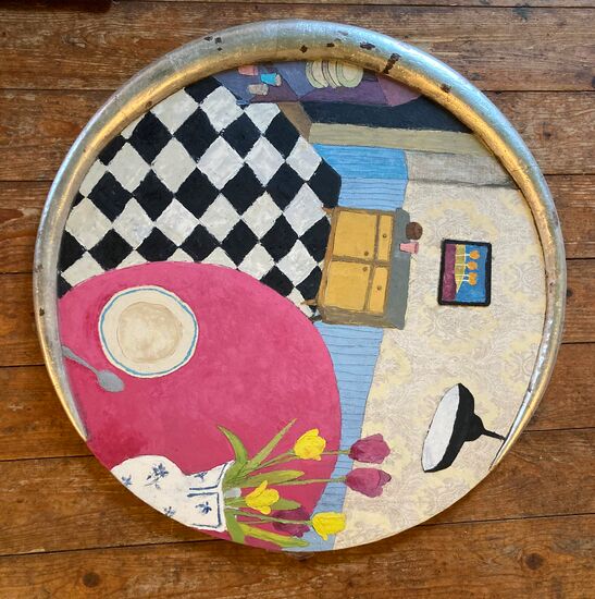 Ausgebildet in Restaurierung an der Hochschule für Bildende Künste in Dresden - nach Studien der Theologie und Philosophie - verbindet sie geistige Tiefe mit handwerklicher Präzision. Ganz bewusst greift sie auf historische Maltechniken zurück und nutzt für ihre kleinen und großen Tafelbilder Pigmente, Leime und Bindemittel, die seit Jahrhunderten Geschichten erzählen. Besonders charakteristisch ist ihre Wahl des Malgrundes. Sie sammelt, was andere übersehen oder wegwerfen: Tapetenreste, ausrangierte Möbelstücke, Holzrahmen, Textilien. Fundstücke vom Straßenrand oder Sperrmüll werden zu poetischen Bildträgern, mit sichtbaren Zeichen gelebter Zeit.