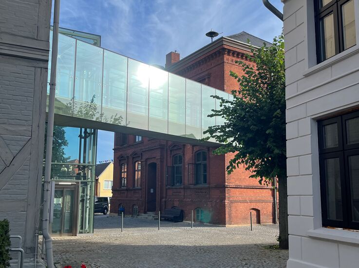 Das Rathaus mit Aufzug und das ehemalige Amtsgerichtsgebäude, verbunden mit einem Gang aus Glas und Stahl, sind heute der gemeinsame repräsentative Verwaltungssitz des Amtes Malchow.
