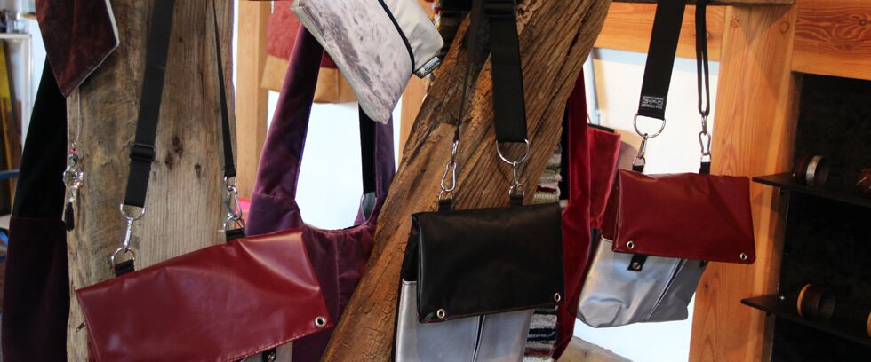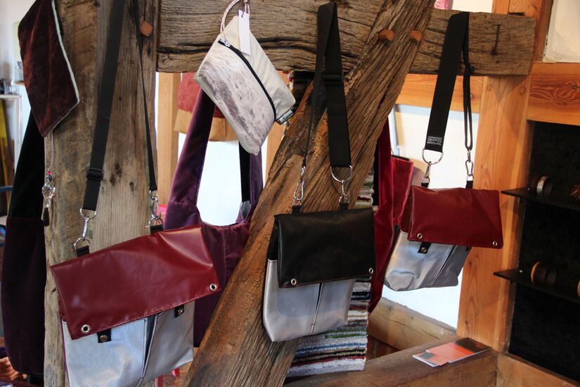 Überdies experimentiert sie mit dem widerstandsfähigen Hightech-Material, das ihr Mann als Segelmacher verwendet, mit Segeltuch, Gurten und Schnallen. So entstehen hochwertige, langlebige und zugleich schöne Taschen, Kissen und Sonnen-Segel für den Outdoorbereich.