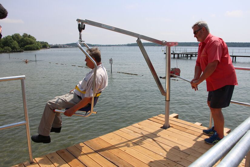 - eine Badebrücke mit Rampe und barierrefreiem Lift